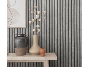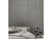 Vliesové tapety na zeď, 3D design dřevěného obložení, lamel v odstínu šedého dřeva, šedo-černé metalické mezery mezi lamelami. Co vás zaujme: autentický vzhled, vysoká odolnost a omyvatelnost. Design: 3D, nadčasové, eklektický. Úroveň tapetovéní: pro začá