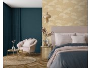Luxusní vliesové tapety s vinylovém povrchem, béžové pololesklé plastické metalické listy, zlaté obrysy. Foto interiéru je pouze ilustrační - odlišné barvy.