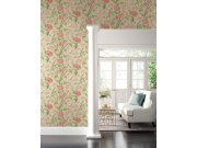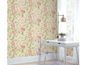Světle béžové vliesové tapety na zeď, rozkvetlé větvičky v odstínech korálové, zelené a krémové, motýli a ptáčci.