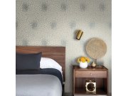 Luxusní béžovo-stříbrná tapety na zeď s geometrickými ornamenty se zlatavými odlesky. Foto interiéru je pouze ilustrační - odlišné barvy.