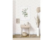 Matná, bílá vliesové tapety s květinovém vzorem šedo-zelených větviček s květy a plody, podklad imitující jemnou omítku. Foto interiéru je pouze ilustrační - odlišné barvy.