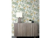 Bílá vliesové tapety na zeď, motiv exotické květiny Protea v odstínech zelené, žluté a tyrkysové.