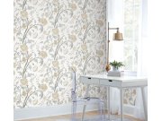 Bílá vliesové tapety na zeď, listy a rostliny v odstínech béžové, šedé a zlato-béžové.