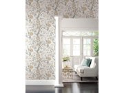 Bílá vliesové tapety na zeď, motýli, ptáčci a rozkvetlé větvičky v odstínech šedé a béžové, zlaté a stříbrné metalické detaily.