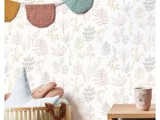 Bílá vliesové tapety na zeď, listy a rostliny v odstínech béžové, šedé a zlato-béžové.