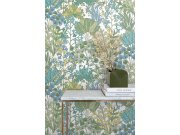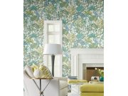 Bílá vliesové tapety na zeď, rostliny a listy v odstínech zelené, modré, žluté a béžové.