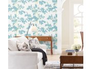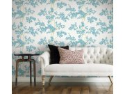 Bílá vliesové tapety na zeď, rostliny a listy v odstínech zelené, modré, žluté a béžové.