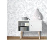 Bílá vliesové tapety, šedomodré obrysy palmovéch listů. Tapety vhodná do ložnice, obýváku, pracovny.