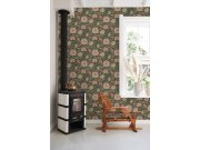 Černá vliesové tapety na zeď, květinové vzor v odstínech zelené, hnědé, šedé a terakota.