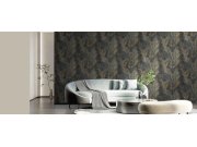 Luxusní plastické černá vliesové tapety s vinylovém povrchem, motivy větviček a listů v odstínech šedé, pololesklé zlaté a bronzové; hrubší textura.
