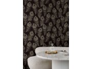 Luxusní plastické černá vliesové tapety s vinylovém povrchem, motivy větviček a listů v odstínech šedé, pololesklé zlaté a bronzové; hrubší textura.
