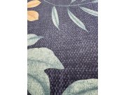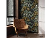 Černá vliesové tapety na zeď, motivy listů v odstínech zelené, hnědé a oranžové.