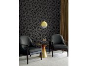 Luxusní plastické černá vliesové tapety s vinylovém povrchem, motivy větviček a listů v odstínech šedé, pololesklé zlaté a bronzové; hrubší textura.
