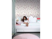 Hladká vliesové tapety na zeď, stromy, duha, hvězdičky a jednorožci v odstínech lila, hnědé a béžové.