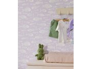 Hladká vliesové tapety na zeď, stromy, duha, hvězdičky a jednorožci v odstínech lila, hnědé a béžové.