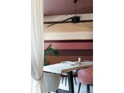 Vliesové obrazové tapety s pruhy v odstínech cihlově červené, fialové, červené, růžové. Foto interiéru je pouze ilustrační-odlišné barvy. Tapety má návazný vzor, pro větší šířku lze přikoupit další kus
