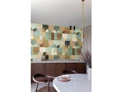 Geometrické vliesové tapety s vinylovém povrchem - střídání jemného pololesku a matu, hladkých a strukturovaných ploch, odstíny béžové, hnědé a zelené. Foto interiéru je pouze ilustrační.