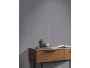 Jemná vliesové geometrické tapety s elegantními křivkami růžového zlata na šedém texturovaném pozadí.