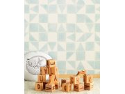 Vliesové, dětské tapety. Trojúhelníky a čtverce v šedo-černých odstínech, metalické krémové, částečně setřené, obrysy.