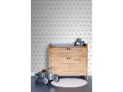 Bílá vliesové tapety s černými obrysy trojúhelníků.
