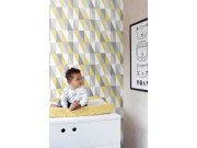 Geometrické vliesové tapety na zeď, bílé, šedé a okrové trojúhelníky.