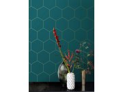 Hladká tyrkysové vliesové tapety na zeď, zlaté obrysy hexagonů. Co vás zaujme: vyrobeno s ohledem na udržitelnost a ekologii. Design: grafický. Úroveň tapetovéní: pro začátečníky. Země původu: Holandsko.