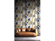 Luxusní plastické vliesové tapety s vinylovém povrchem, geometrický vzor v odstínech hnědé, béžové, krémové, modré a šedo-modré; hrubší textura.