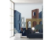 Grafické vliesové tapety na zeď, odstíny hnědo-červené, modré, okrové, zelené a šedo-béžové, architektonický design. z 5 dílů 0,53 x 280cm. Tapety má navazující vzor, pokud potřebujete pokrýt širší stěnu, stačí přikoupit další kus (sadu 5 pruhů). Jednotli
