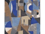 Grafické vliesové tapety na zeď, odstíny modré, hnědo-červené, modré, hnědé a šedé, architektonický design. z 5 dílů 0,53 x 280cm. Tapety má navazující vzor, pokud potřebujete pokrýt širší stěnu, stačí přikoupit další kus (sadu 5 pruhů). Jednotlivé pruhy