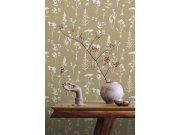 Luxusní hnědá vliesové tapety s vinylovém povrchem, efekt jemné textilie s rozkvetlými větvičkami v odstínech hnědo-zlaté a bílé.
