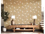Luxusní hnědá vliesové tapety s vinylovém povrchem, efekt jemné textilie s rozkvetlými větvičkami v odstínech hnědo-zlaté a bílé.