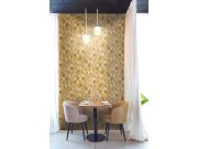 Luxusní plastické vliesové tapety s vinylovém povrchem, geometrický vzor v odstínech hnědé, béžové, okrové a terakota; hrubší textura. Foto interiéru je pouze ilustrační - odlišné barvy.
