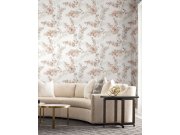 Bílá vliesové tapety na zeď, květinové vzor evokuje malbu akvarelem, odstíny hnědé a šedé, metalické zlaté detaily.
