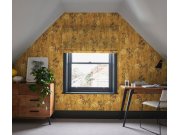Pololesklá hořčicové vliesové tapety na zeď, květiny a listy v odstínech černé, červené a zlato-béžové.