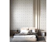 Luxusní krémové / ecru vliesové tapety s vinylovém povrchem, jemně plastický zámecký damaškové vzor. Foto interiéru je pouze ilustrační - odlišné barvy.