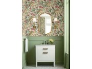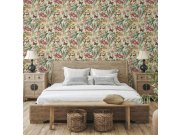 Krémové vliesové tapety na zeď, květiny a motýli v odstínech zelené, červené, hnědé a šedé.