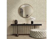 Luxusní krémovo-zlatá tapety na zeď s geometrickým vzorem ve tvaru rybích šupin. Foto interiéru je pouze ilustrační - odlišné barvy.