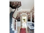 Temně modrá vliesové tapety se secesním květinovém vzorem v odstínech zelené, hnědé, béžové a starorůžové.