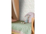 Hladká vliesové tapety na zeď, květinové vzor v pastelovéch odstínech zelené, tyrkysové, růžové a béžové.