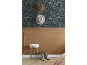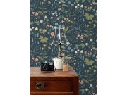 Temně modrá vliesové tapety se secesním květinovém vzorem v odstínech zelené, hnědé, béžové a starorůžové.
