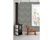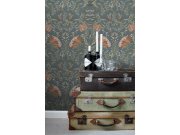 Temně modrá vliesové tapety se secesním květinovém vzorem v odstínech zelené, hnědé, béžové a starorůžové.