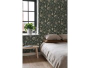 Černá vliesové tapety se secesním květinovém vzorem v odstínech zelené, béžové a hnědé.
