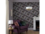 Černá vliesové tapety na zeď, květinové vzor v zelené, fialové, hnědé a růžové.