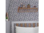 Modrá vliesové tapety na zeď, květinové vzor v odstínech zelené a fialové.