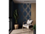 Tmavě modrá vliesové tapety na zeď, geometrický vzor, linie v barvě mědi tvoří kosočtverce.