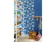 Modré a bílé květy na tmavě modré vliesové tapetě.