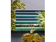 Modrá vliesové tapety na zeď, motiv exotické květiny Protea v odstínech zelené, růžové a béžové.
