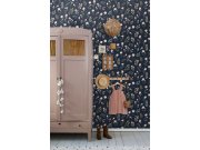 Hladká, tmavě modrá, vliesové tapety na zeď, květinové vzor v odstínech zelené a růžové.