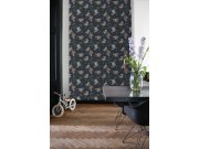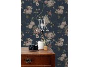 Tmavě modrá vliesové tapety s růžemi v odstínech béžové, starorůžové, hnědé a šedé.