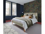 Tmavě modrá vliesové tapety na zeď, květiny a motýli v odstínech zelené, růžové, šedé a hnědé.